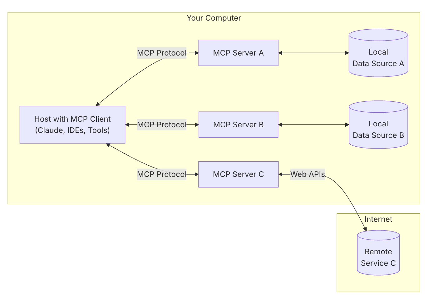 Figure: MCP 아키텍처 개념도 – LLM 호스트(클라이언트)가 여러 MCP 서버에 연결하여 로컬/원격 데이터 소스를 활용한다. MCP에서는 LLM이나 챗봇 애플리케이션이 클라이언트(호스트) 역할을 하며, 필요한 기능별로 여러 MCP 서버에 1:1 연결을 맺어 도구와 컨텍스트를 제공합니다 . 각 MCP 서버는 파일시스템, 데이터베이스, API 등 특정 외부 자원에 대한 인터페이스를 노출하고, 클라이언트는 JSON-RPC 기반 프로토콜을 통해 해당 서버와 요청/응답을 주고받습니다 . 이러한 구조를 통해 하나의 AI 에이전트가 표준화된 방식(MCP)으로 다양한 출처의 정보를 안전하게 가져와 활용할 수 있습니다. 실제로 Anthropic은 MCP를 “AI 분야의 USB-C”에 비유하는데, 각기 다른 도구와 데이터를 AI 모델이 손쉽게 연결할 수 있는 범용 인터페이스를 제공한다는 의미입니다 .
