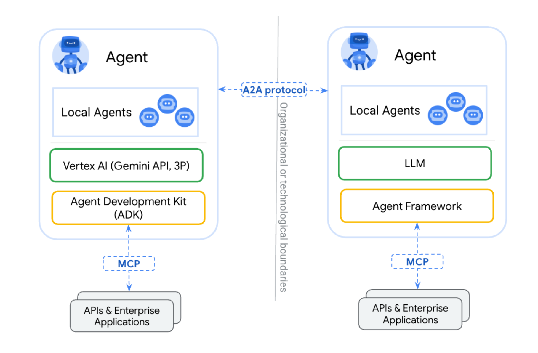 Figure: A2A 프로토콜 개념도 – 두 에이전트(A와 B)가 표준화된 A2A 인터페이스로 상호 통신하는 모습. A2A에서는 각 에이전트가 Agent Card라는 공개 메타데이터(JSON)를 통하여 자신의 기능과 주소를 광고하고, HTTP 기반의 표준 API(A2A 프로토콜 스펙 준수)를 구현하여 외부 요청을 처리합니다 . 이를 통해 클라이언트 에이전트(A)가 원격 에이전트(B)의 엔드포인트로 작업 요청(tasks/send)을 보내면, B는 해당 작업을 수행하면서 메시지 스트림이나 폴링 방식으로 진행 상황 및 결과를 전달합니다 . A2A의 통신 단위는 Task(작업)이며, 각 Task 내에서 주고받는 Message들은 사용자 역할(user)과 에이전트 역할(agent)의 대화 턴으로 표현됩니다 . 메시지에는 텍스트, 파일, 구조화 데이터(JSON) 등 다양한 파트(Parts) 형태의 콘텐츠를 담을 수 있어 복잡한 상호작용도 표현 가능합니다 . 요약하면, A2A는 분산된 에이전트들이 HTTP/JSON을 매개로 서로 요청을 주고받는 상위 통신 레이어라고 볼 수 있습니다.
