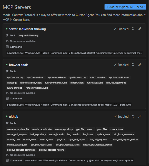 0.47.x 버전 업그레이드 이후, Add new global MCP Server 버튼으로 바뀌고, server url을 추가하는 창 대신에 곧바로 mcp.json 파일이 나옵니다.