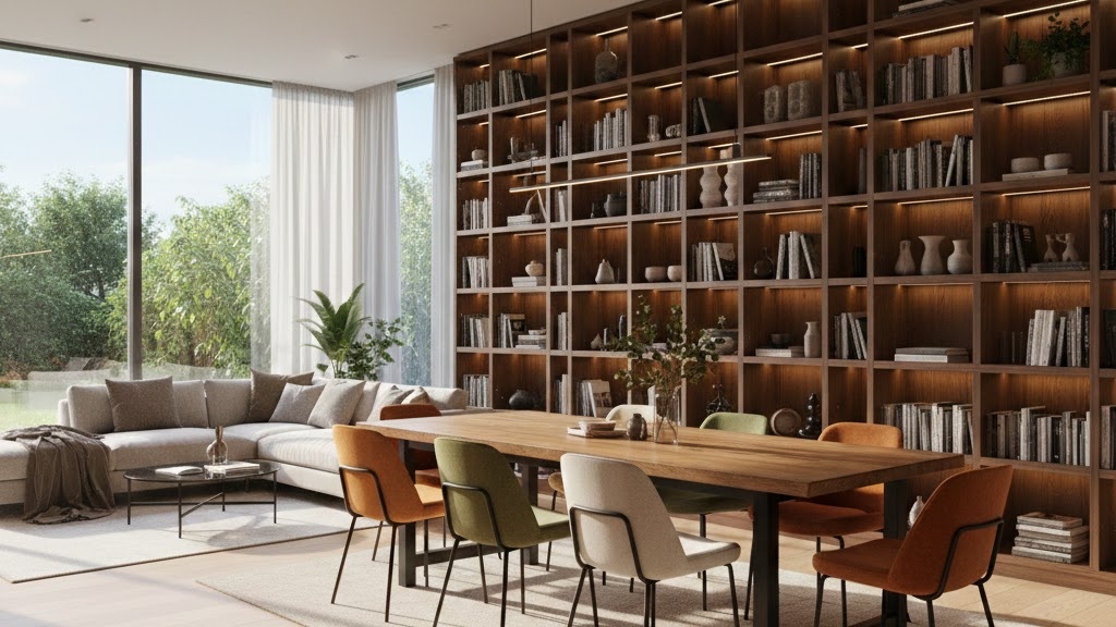 거실 한복판에 널찍한 6인용 테이블을 배치하는 것만으로도 집안의 분위기는 완전히 달라져요. 테이블은 단순히 식사하는 공간을 넘어 아이들의 공부방, 부모님의 홈 오피스, 그리고 온 가족이 모여 보드게임을 즐기는 다목적 '커뮤니티 허브'가 된답니다. 소파가 있던 자리에는 대신 편안한 벤치나 디자인 체어를 배치해 더욱 세련된 느낌을 줄 수 있어요.