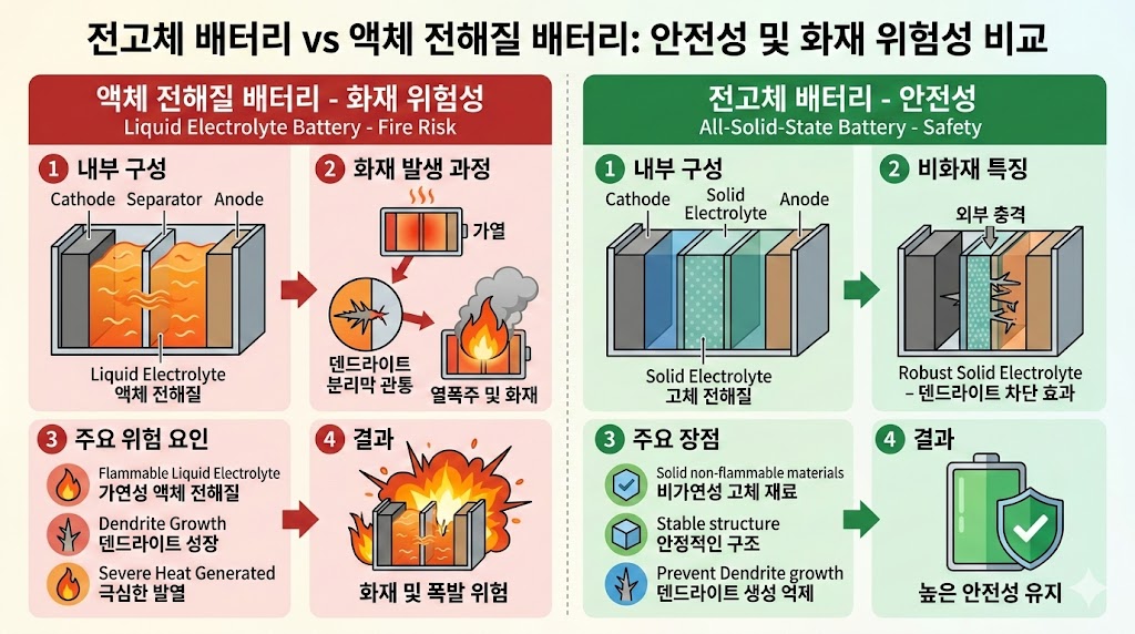 기존 배터리들은 양극과 음극 사이에 이온이 이동할 수 있도록 '액체 전해질'을 채워 넣습니다. 문제는 이 액체가 불이 굉장히 잘 붙는 가연성 물질이라는 점이죠. 사고가 나서 배터리 팩이 파손되면 이 액체가 흘러나와 산소와 만나며 폭발적인 화재로 이어집니다. 하지만 전고체는 이 부분을 고체로 바꿨습니다. 고체는 흘러내리지도 않고, 온도 변화에도 훨씬 둔감합니다.