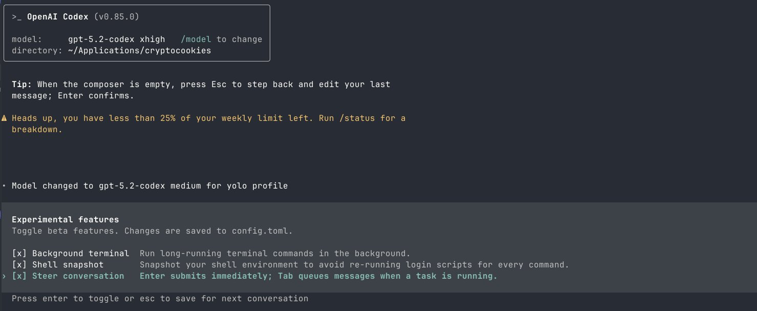 이제 CLI 내에서 중단 없이 코덱스를 중간에 조종하고 거의 실시간으로 에이전트가 적응하는 모습을 볼 수 있습니다. /experimental에서 활성화