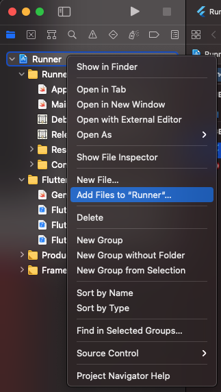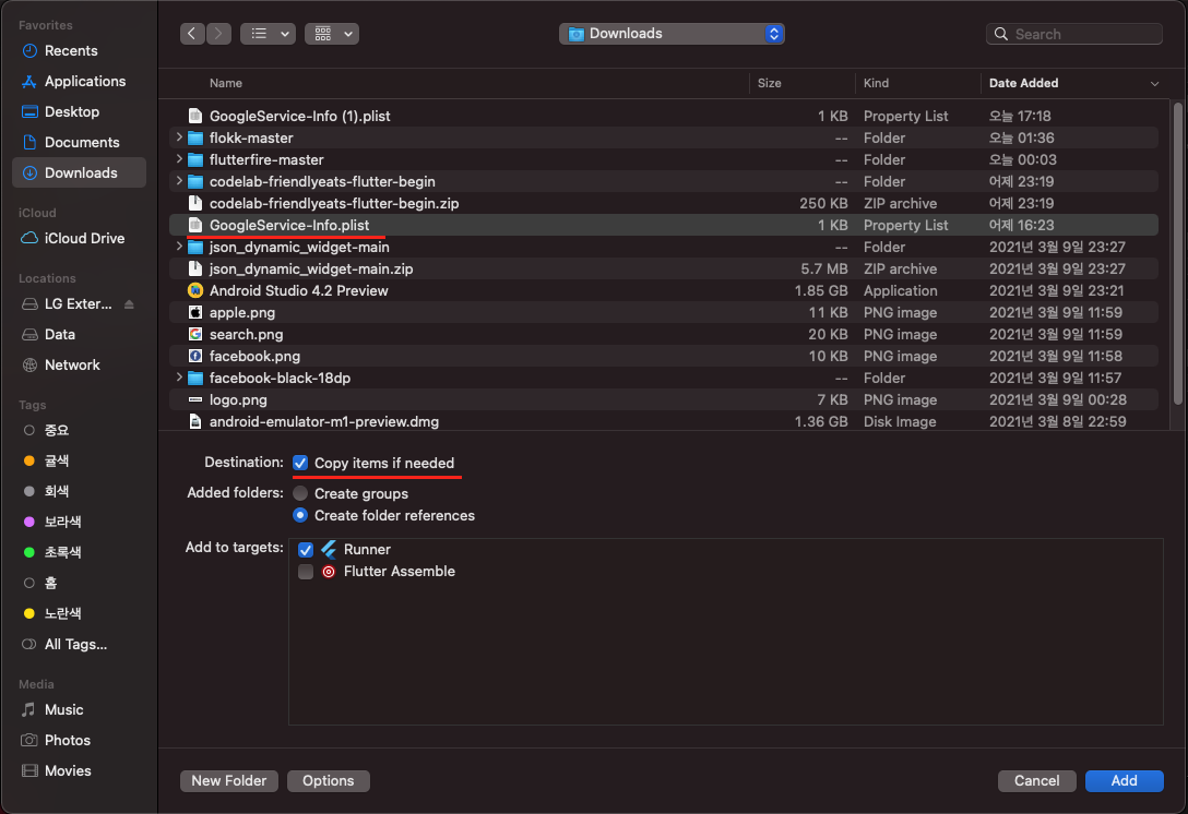 Runner 선택 및 오른쪽 버튼 클릭 > Add Files to "Runner" 클릭 > (Copy items if needed 옵션 선택) > GoogleService-Info.plist 선택 추 (* Runner 폴더 밑으로 추가를 해주셔야 합니다)