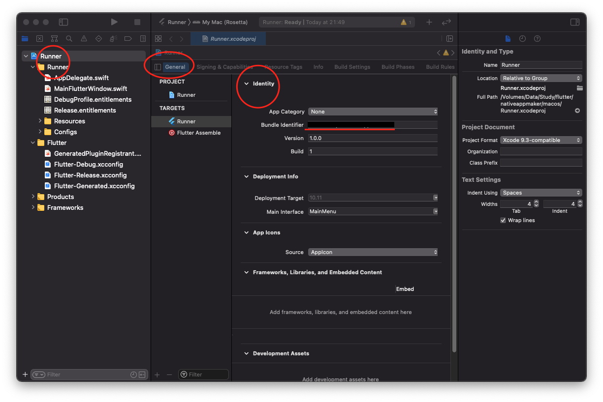 os(macos)/Runner.xcworkspace 프로젝트를 Xcode로 열고, 최상단 Runner 선택 후 General 탭 > Identity 영역 > Bundle Identifier 항목 확인.