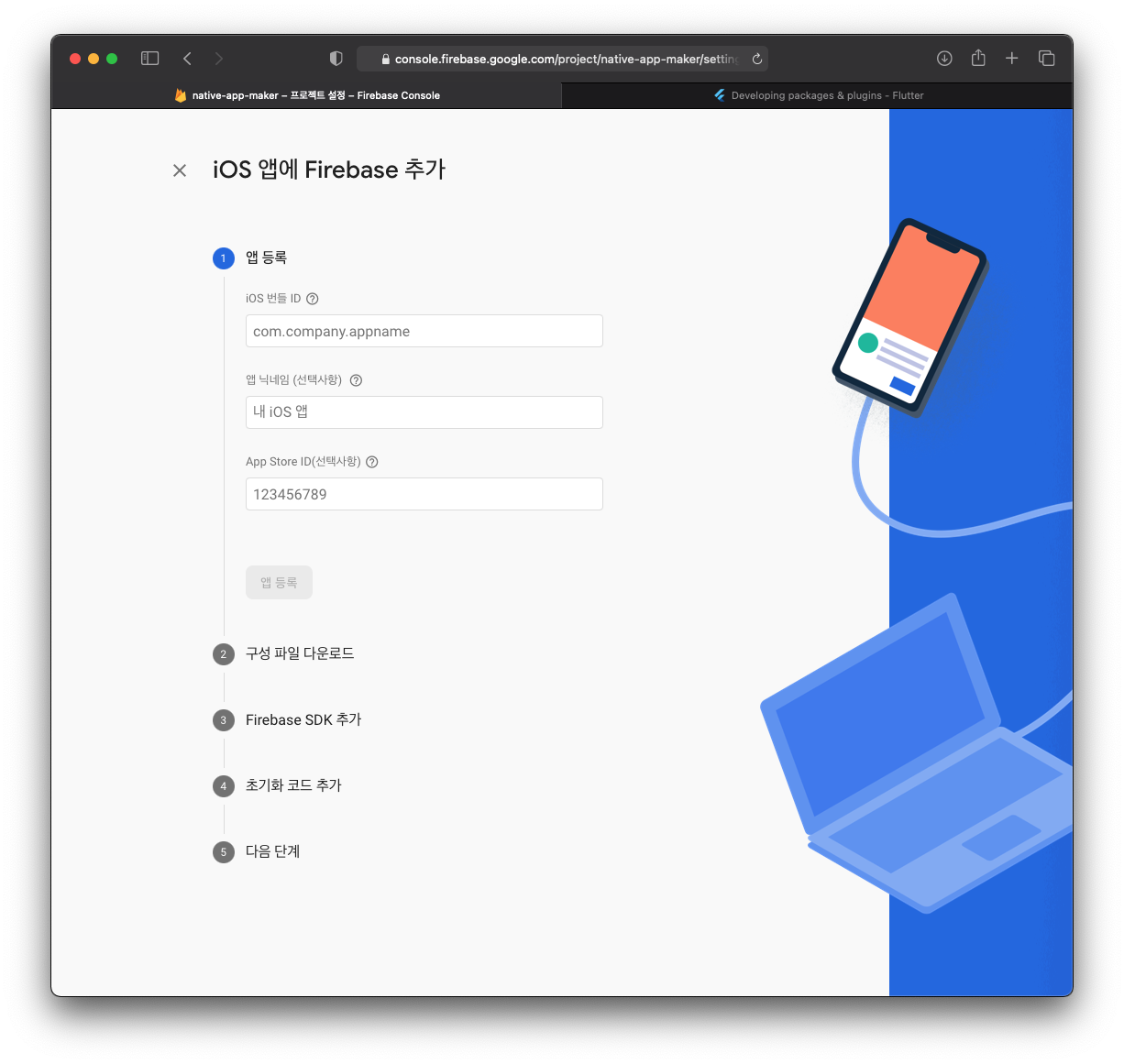 로컬 머신에서 flutter 프로젝트를 생성하고, Firebase Console에 프로젝트 생성 혹은 기존 프로젝트에서 앱 추가를 합니다.