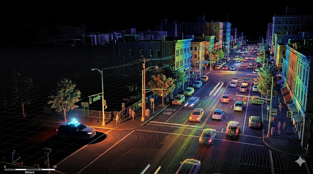 라이다는 레이더의 '전자기파' 대신 '레이저(빛)'를 쏘는 센서입니다. 수만 개의 레이저 빔을 사방으로 쏘아 올린 뒤 돌아오는 시간을 계산해 주변의 모든 환경을 3차원 점구름(Point Cloud) 형태로 재구성합니다.