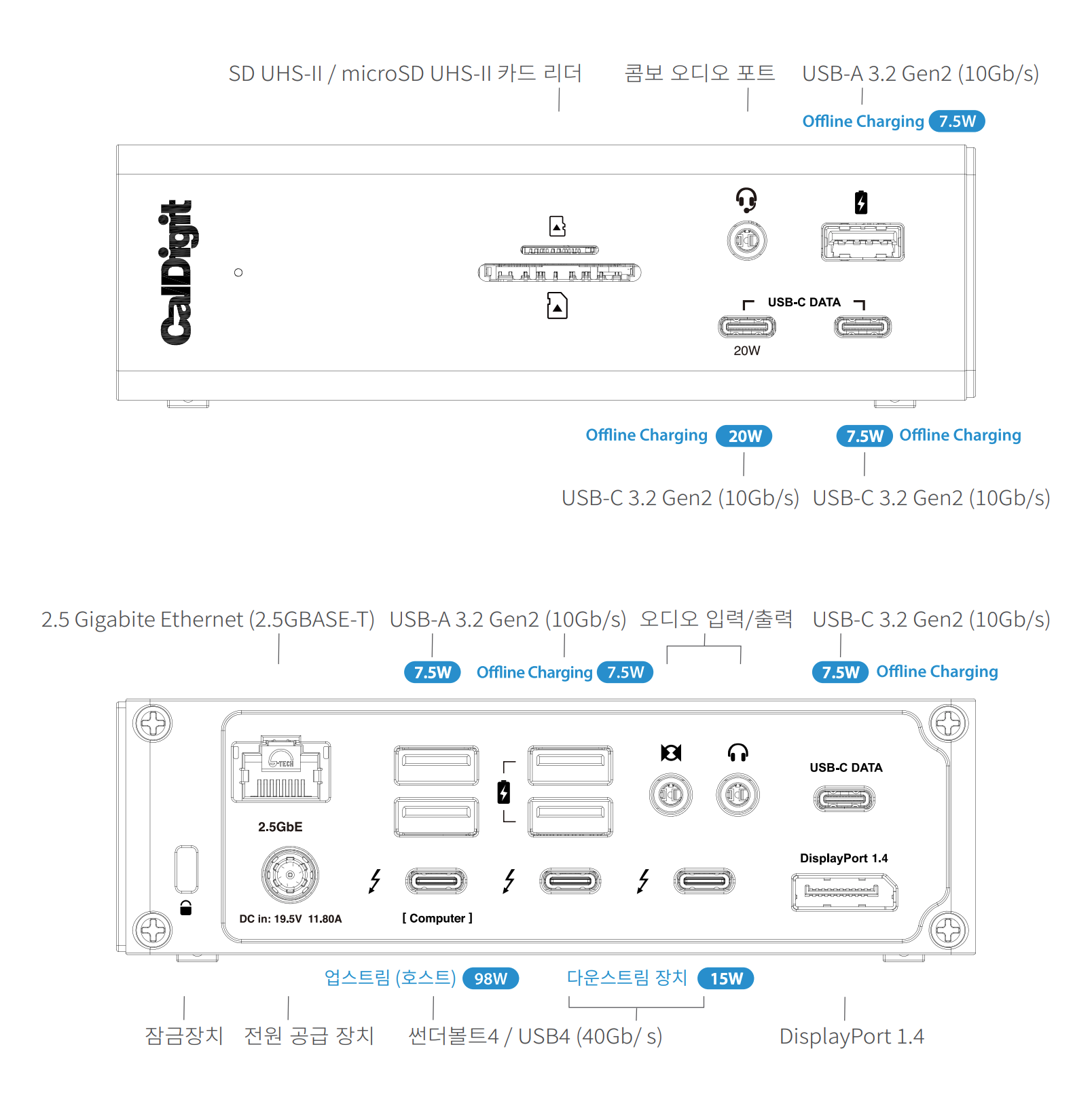 - 오프라인 충전 지원 (배터리 아이콘 표시된 포트)