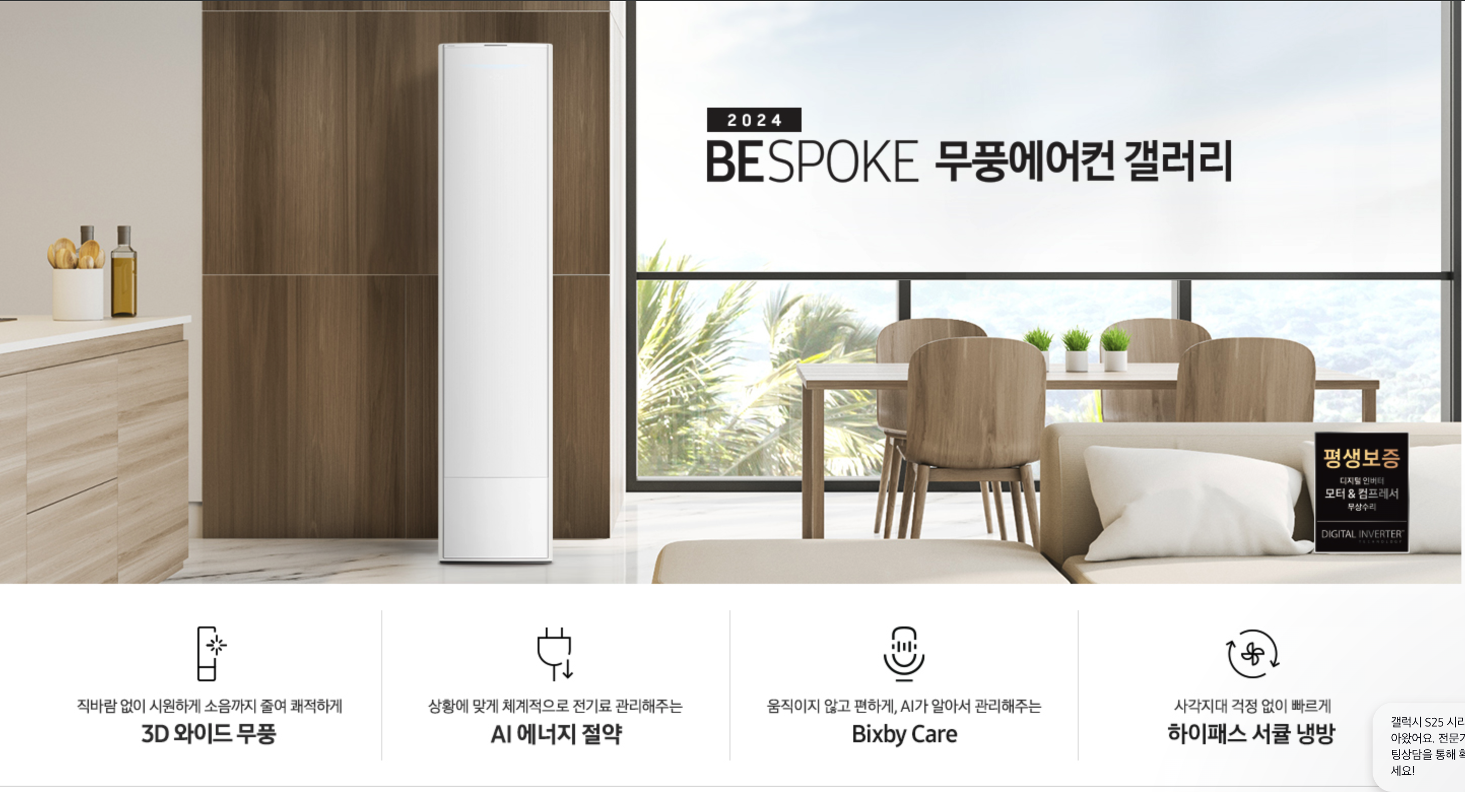 • 세련된 디자인 옵션: BESPOKE 무풍 갤러리 라인으로 출시되어 실내 인테리어에 녹아드는 깔끔한 디자인을 가지고 있으며, 색상 커스터마이징 등 BESPOKE 디자인 장점도 있습니다. (에센셜 화이트 등 다양한 색상 선택 가능 )