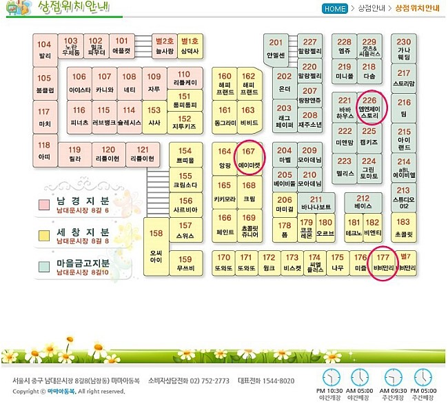 남대문 아동복 쇼핑의 중심은 부르뎅, 포키, 마마, 원아동복 4대 상가입니다. 각 상가마다 스타일이 조금씩 다르니 취향에 맞는 곳을 먼저 공략하는 것이 체력을 아끼는 지름길입니다. 대부분의 상가는 오전 9시 30분에 오픈하여 오후 5시에 폐점합니다. (야간 시장은 밤 22:30~새벽 05:00)
