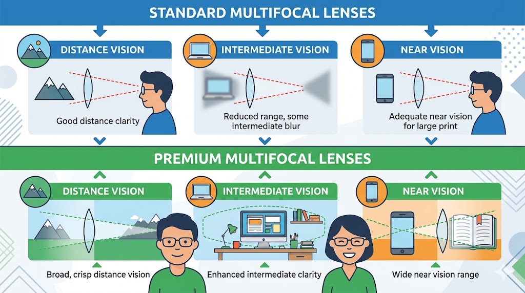 비싼 렌즈일수록 '시야 폭'이 넓어집니다. 다초점렌즈는 하나의 렌즈 안에 먼 곳, 중간 거리, 가까운 곳을 보는 도수가 모두 들어있어 필연적으로 주변부에 어지러움을 유발하는 '수차'가 발생합니다. 프리미엄 렌즈는 이 수차를 극단적으로 줄여서 고개를 크게 돌리지 않아도 넓고 선명한 시야를 제공합니다. 운전을 많이 하거나 모니터를 장시간 봐야 하는 직장인이라면 예산을 조금 더 투자하더라도 중급형 이상의 제품을 추천드리는 이유입니다.