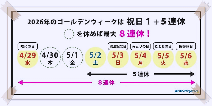 2026년 골든위크는 **4월 29일(수) '쇼와의 날'**부터 시작됩니다. 5월 1일(금)과 5월 4일(월) 사이에 끼어 있는 평일들을 어떻게 활용하느냐가 이번 여행의 성패를 가르는데요. 주요 공휴일 일정은 다음과 같습니다.